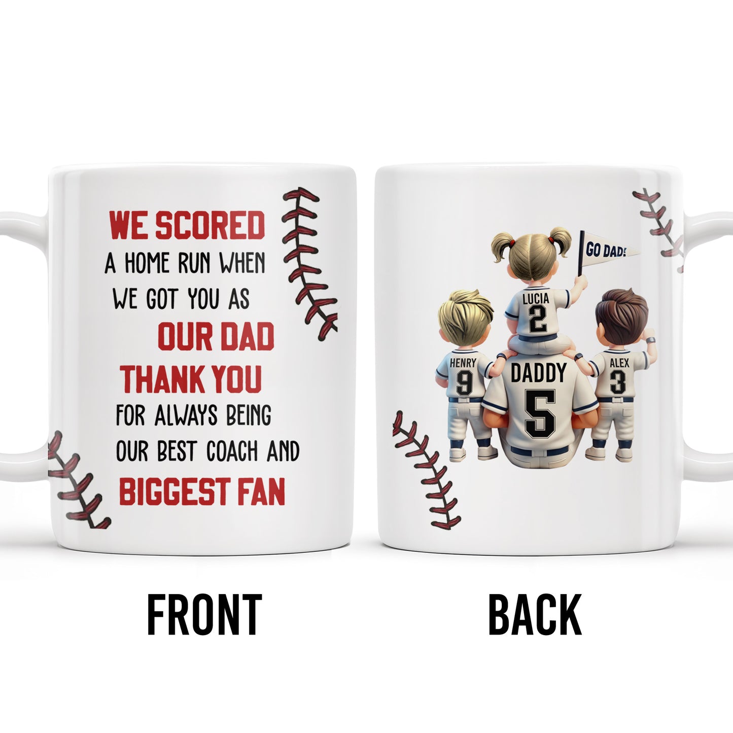 We Scored A Home Run When We Got You As Our Dad, Baseball Stitches And Uniforms, Personalized Custom Coffee Mug, Gift For Dads