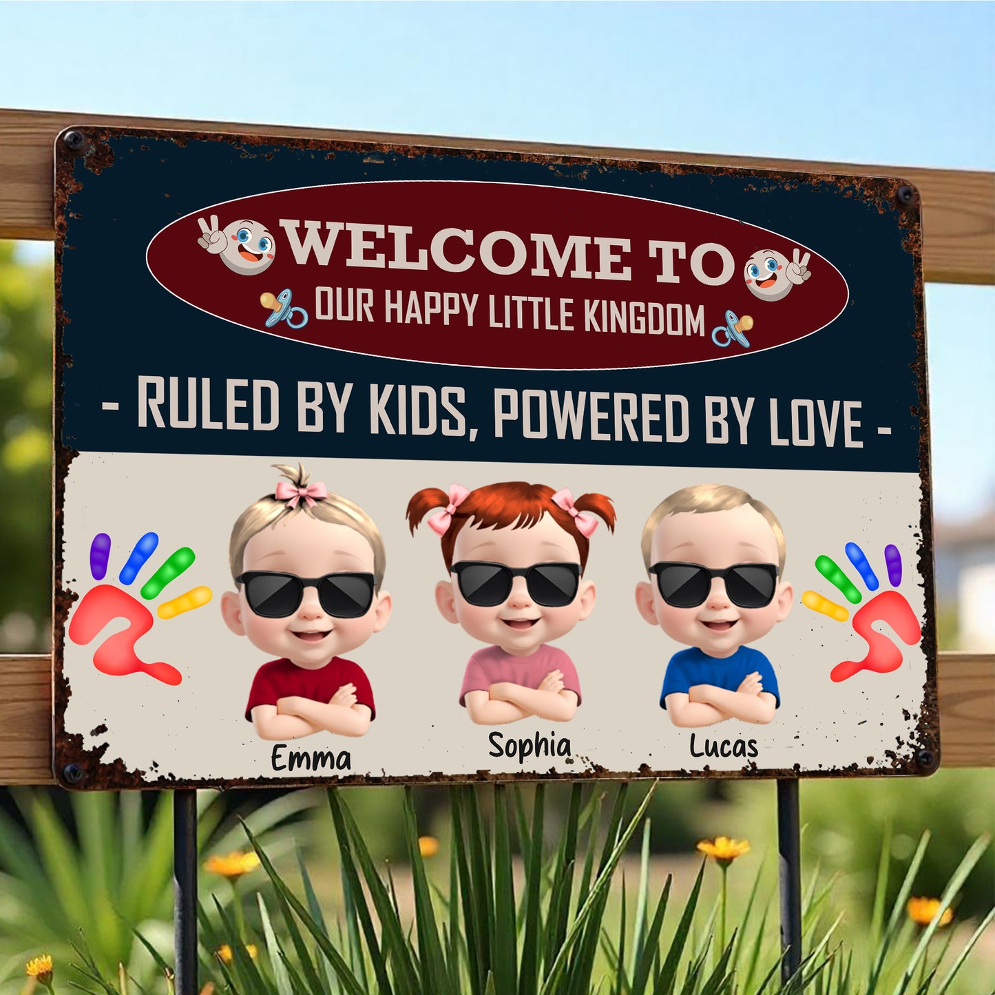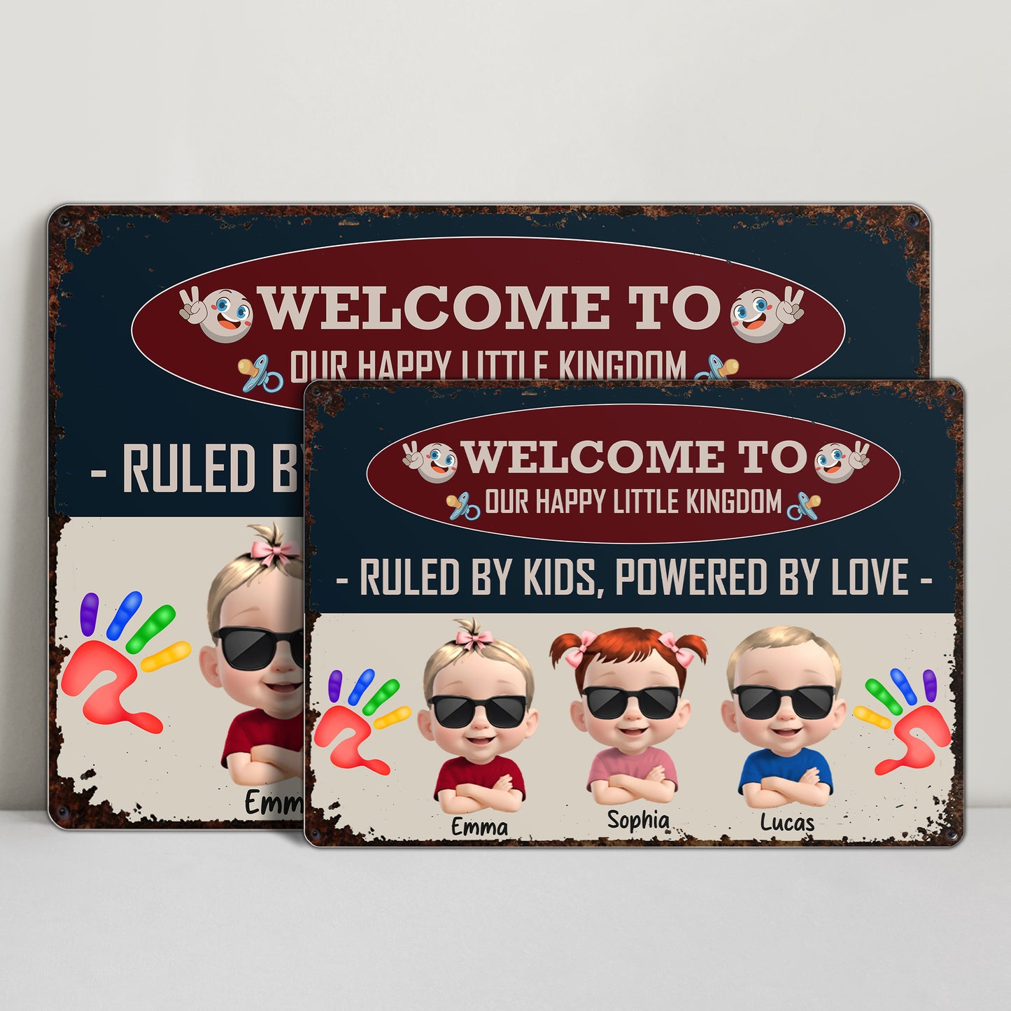 Welcome To Our Happy Little Kingdom, Ruled By Kids, Powered By Love, Children and Handprints - Personalized Metal Sign - FAM032_MSIGN