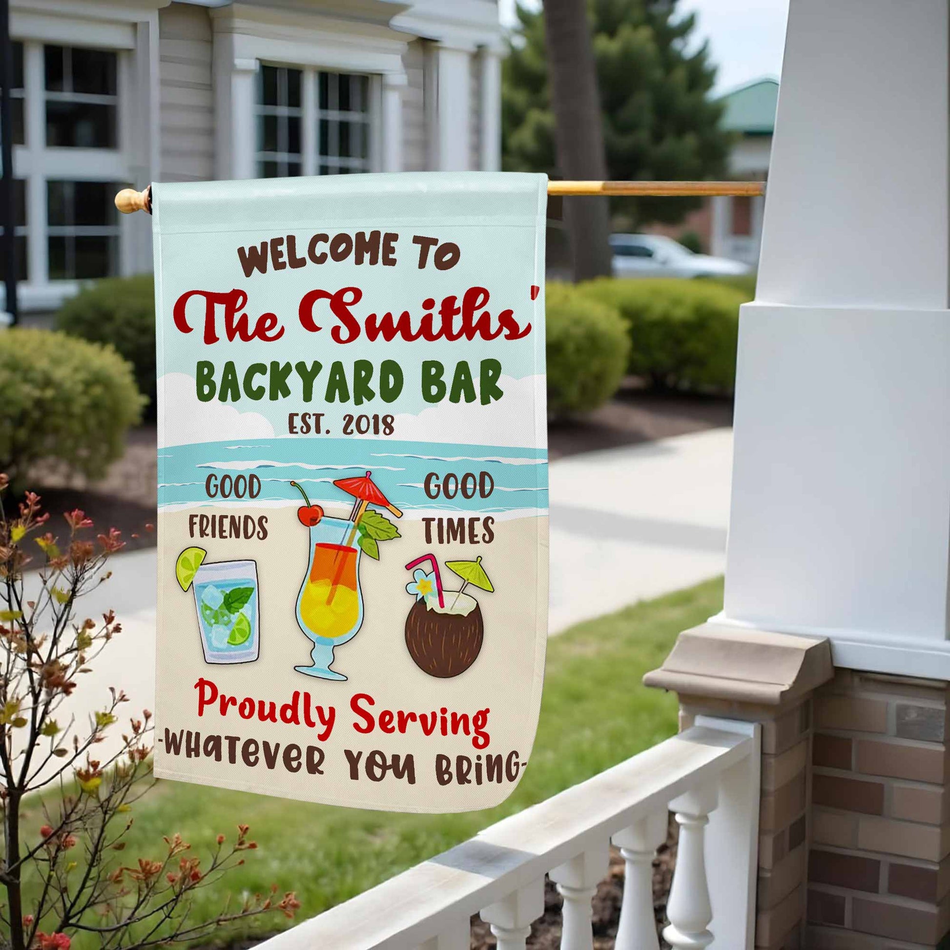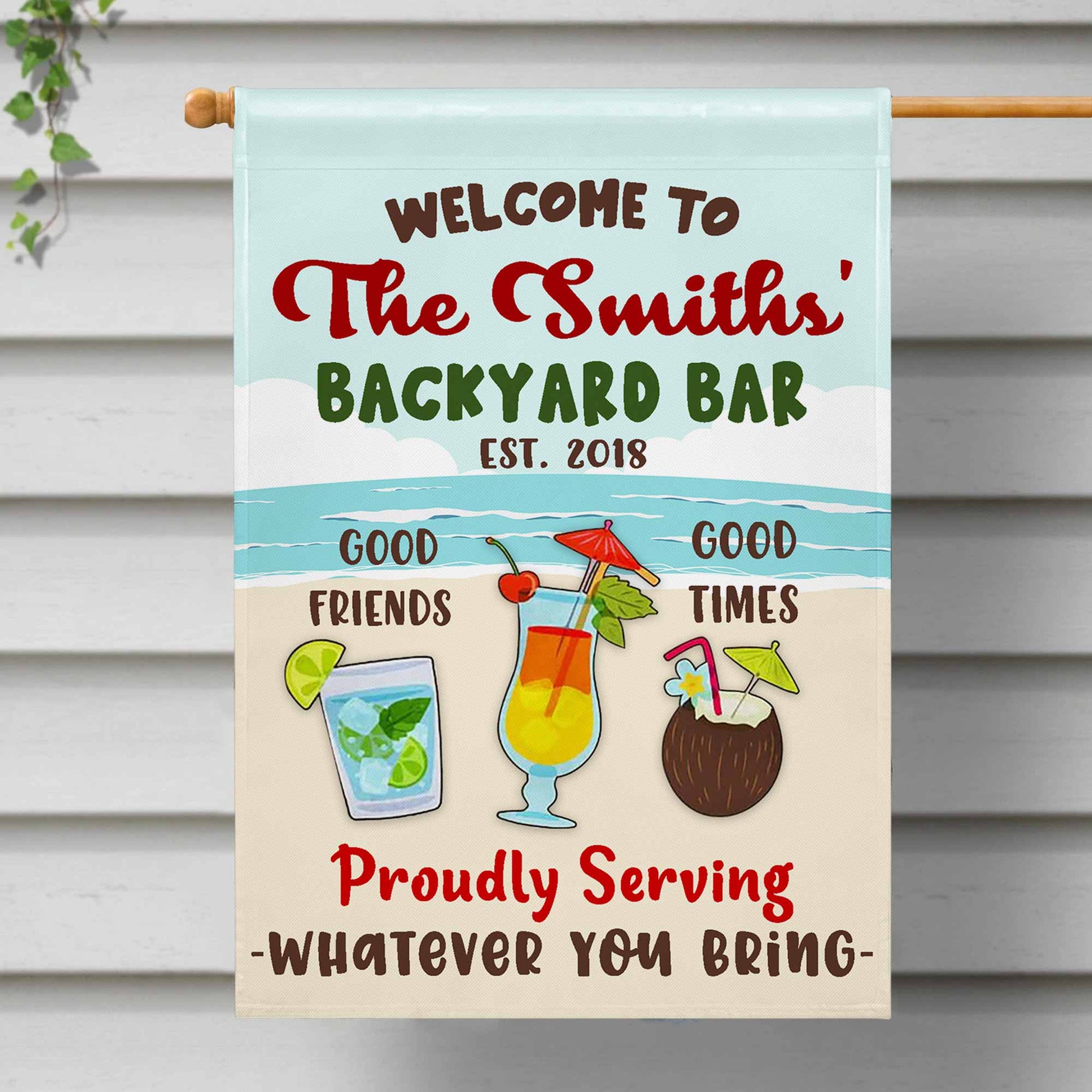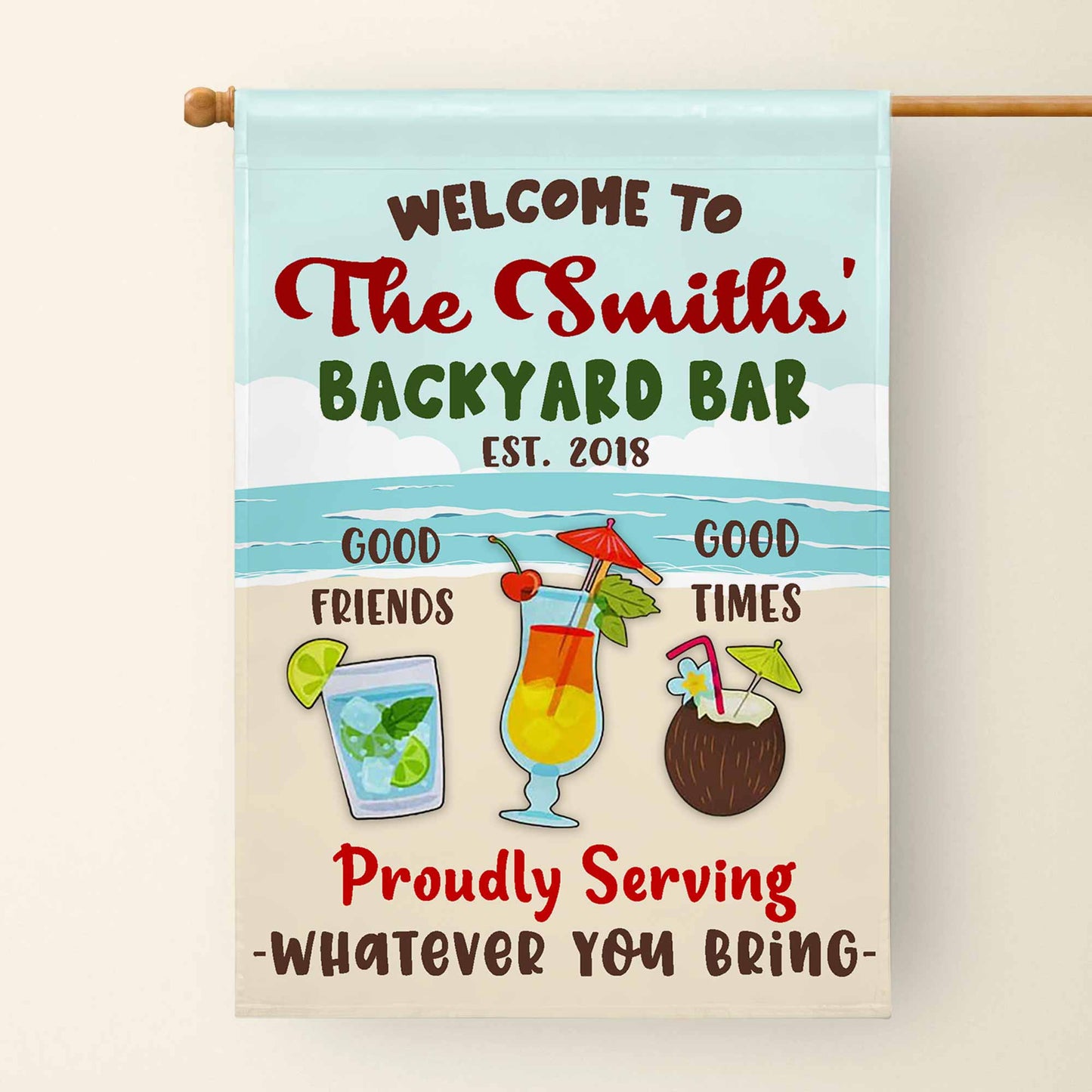 Welcome To The Backyard Bar, Proudly Serving Whatever You Bring - Personalized Flag - FAM414_GAF