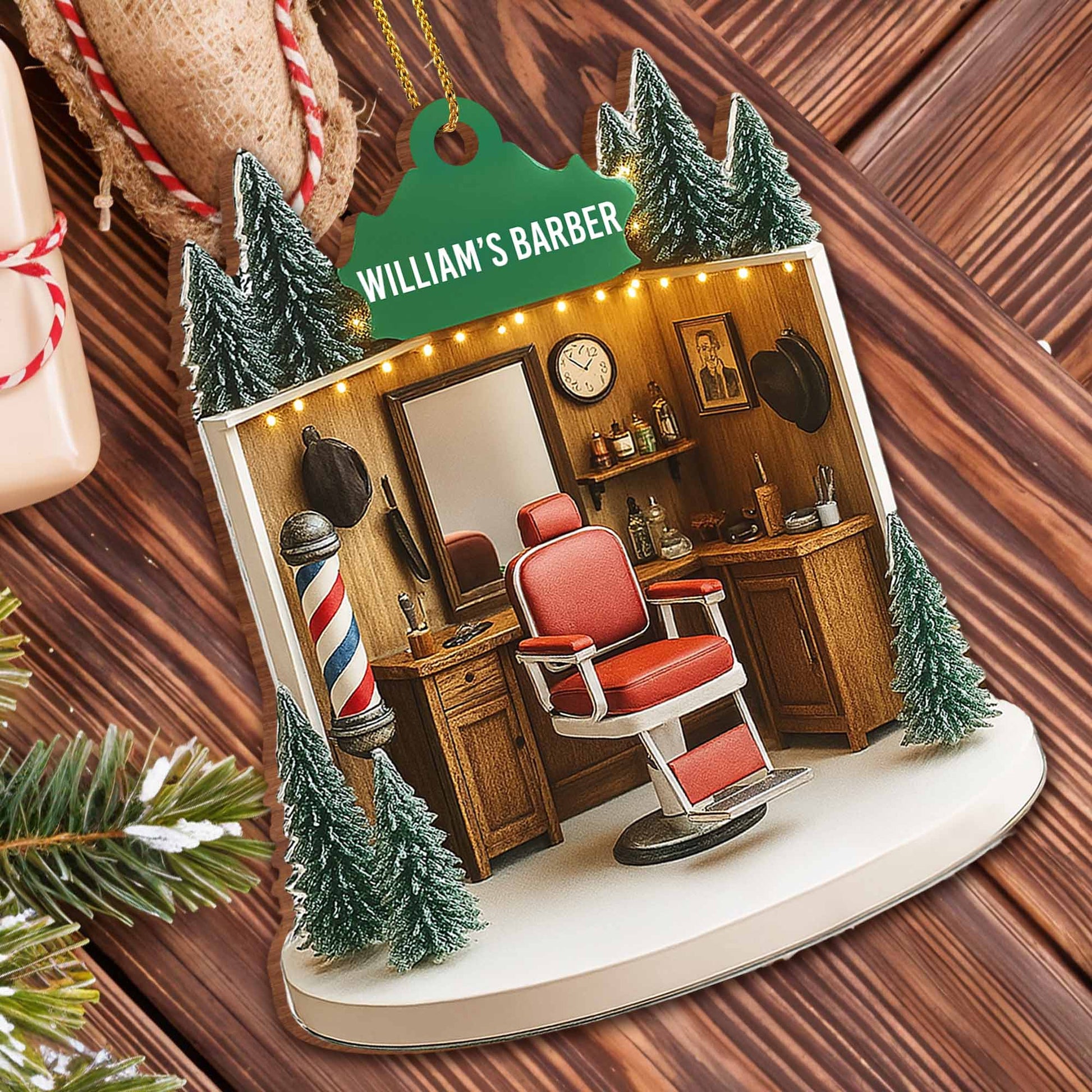 William's Barber, Barber Chair And Pole - Personalized Custom Wood Ornament, Custom Shaped - XMAS067_WDO