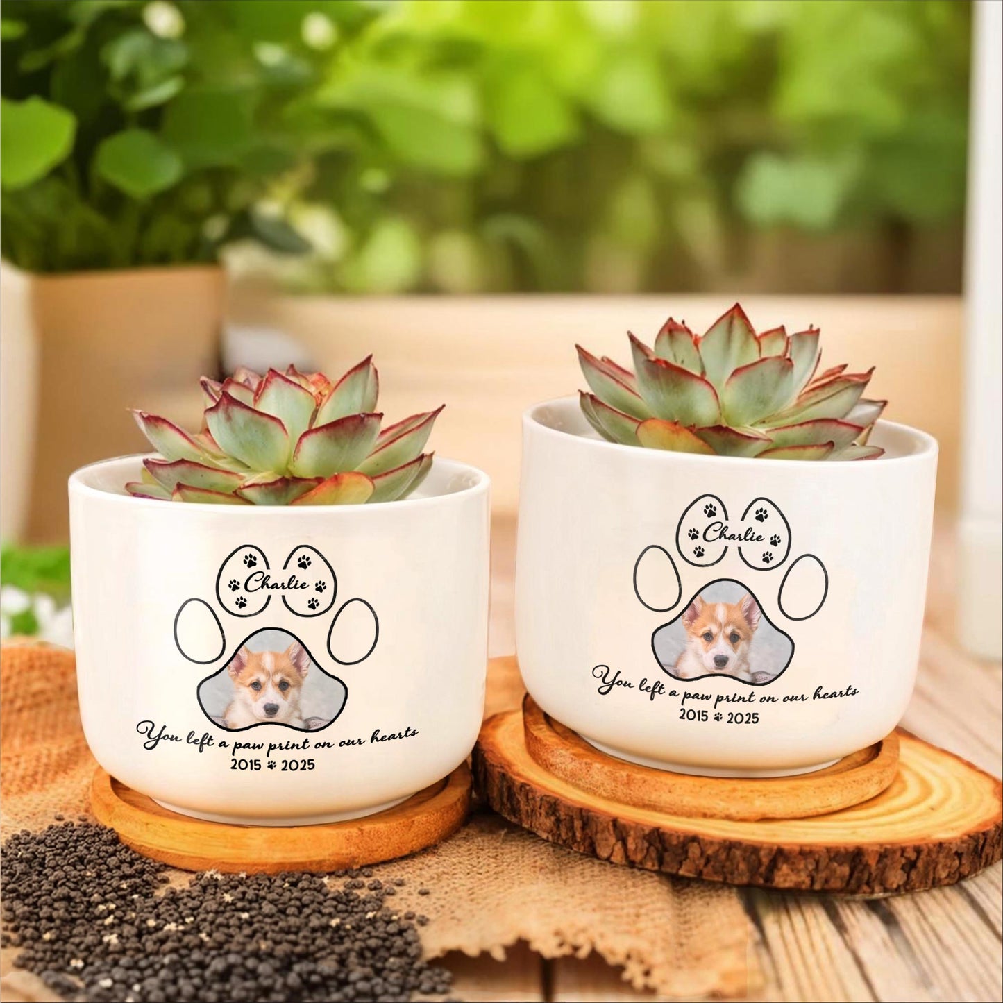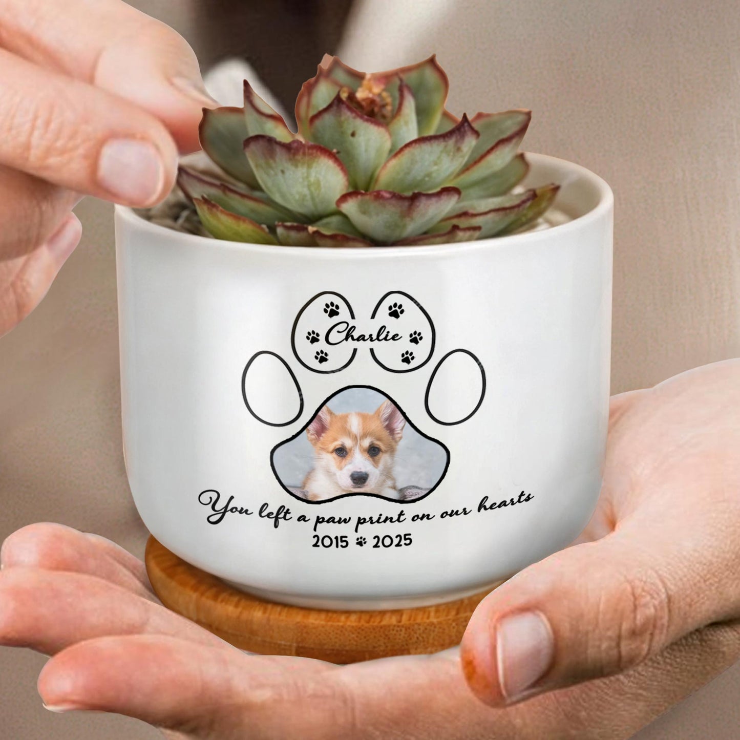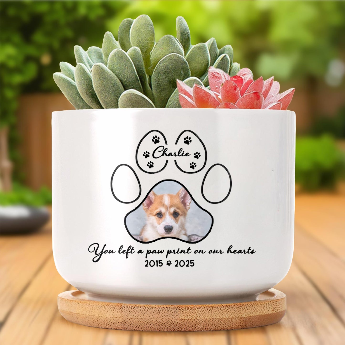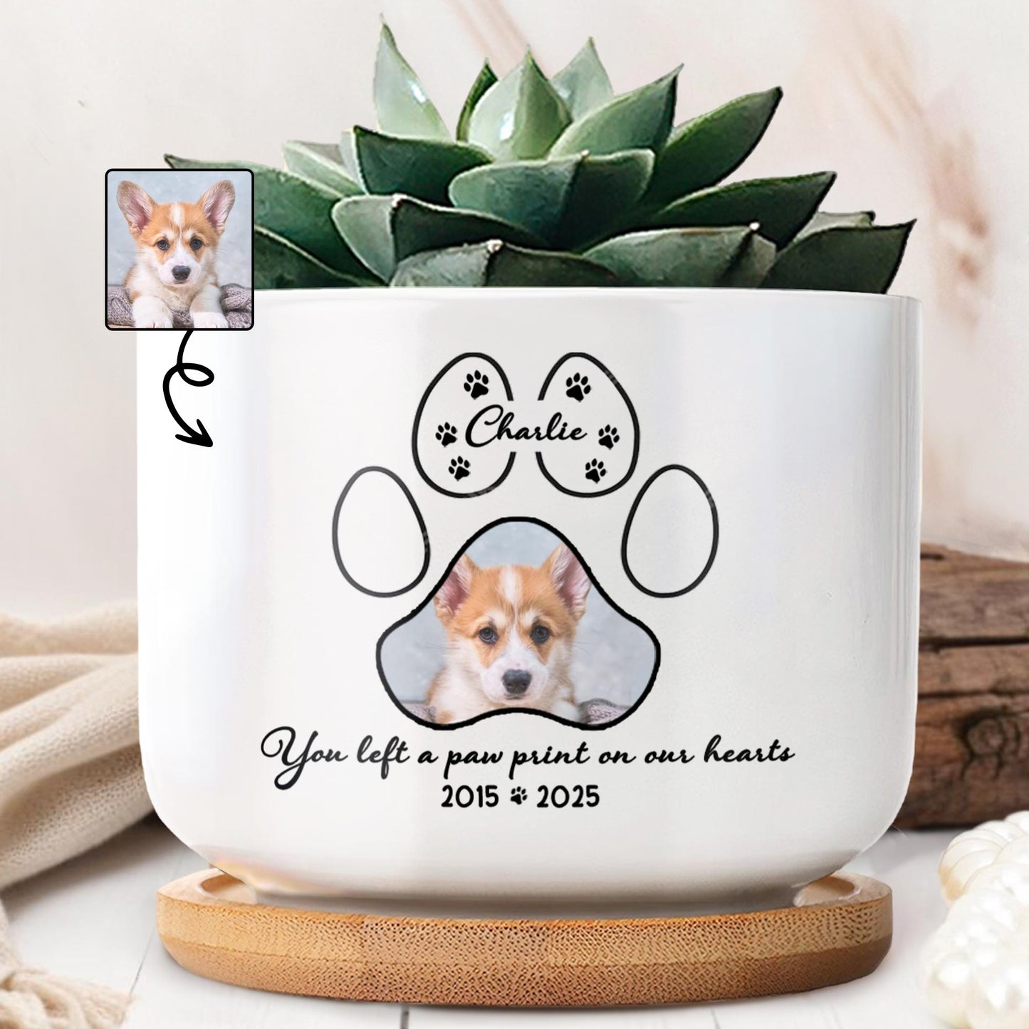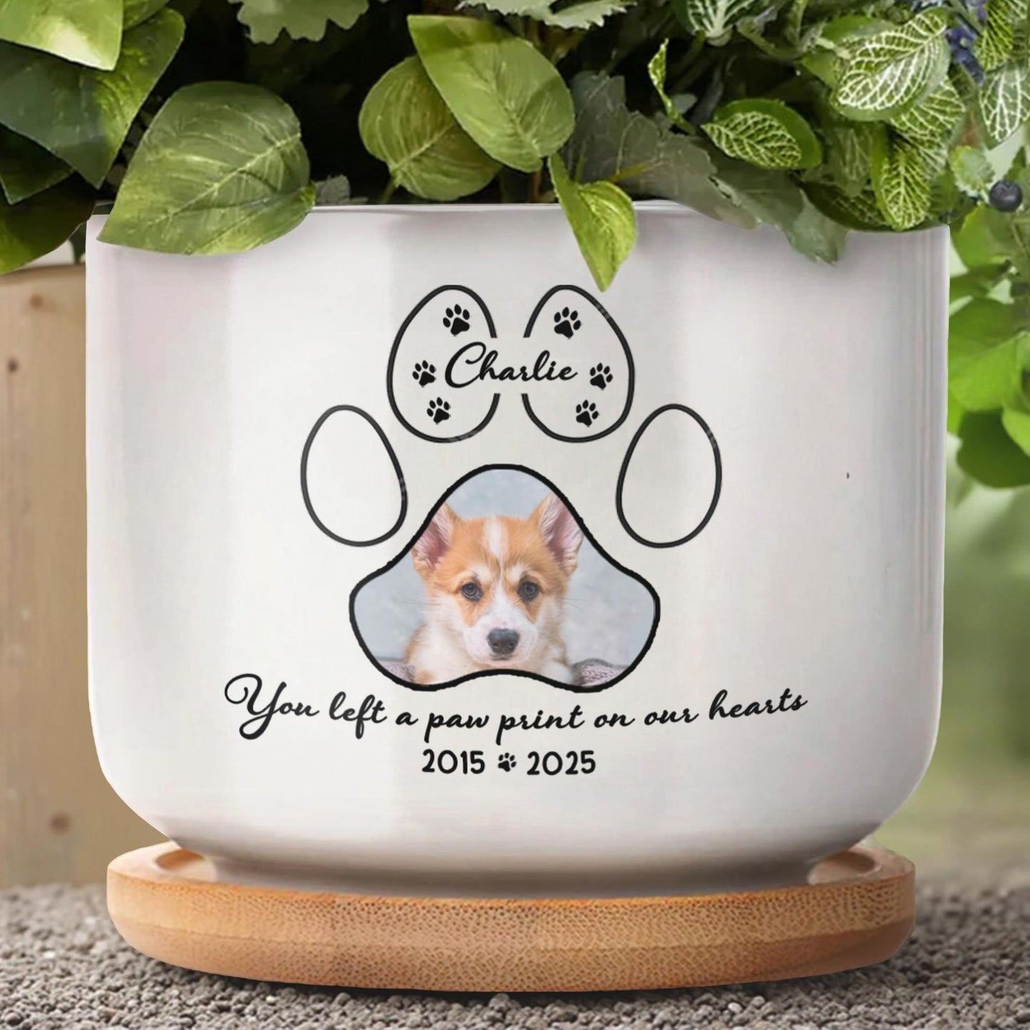 You Left A Paw Print On Our Hearts, Paw Prints And Dog Photo - Personalized Ceramic Plant Pot - PME052_CEP
