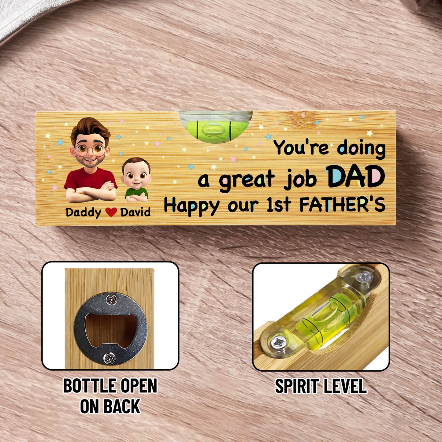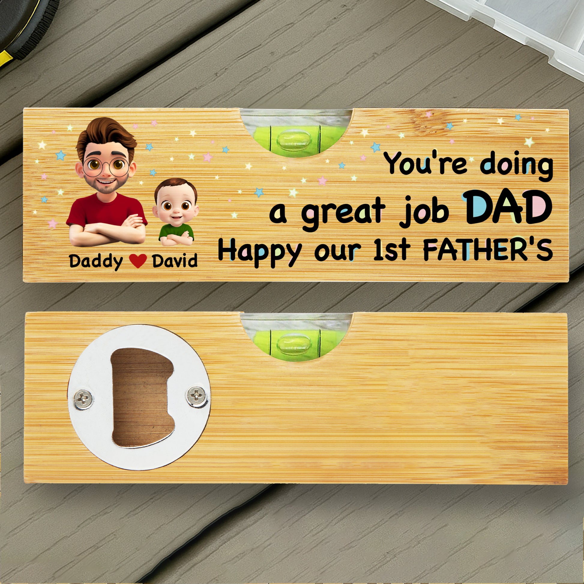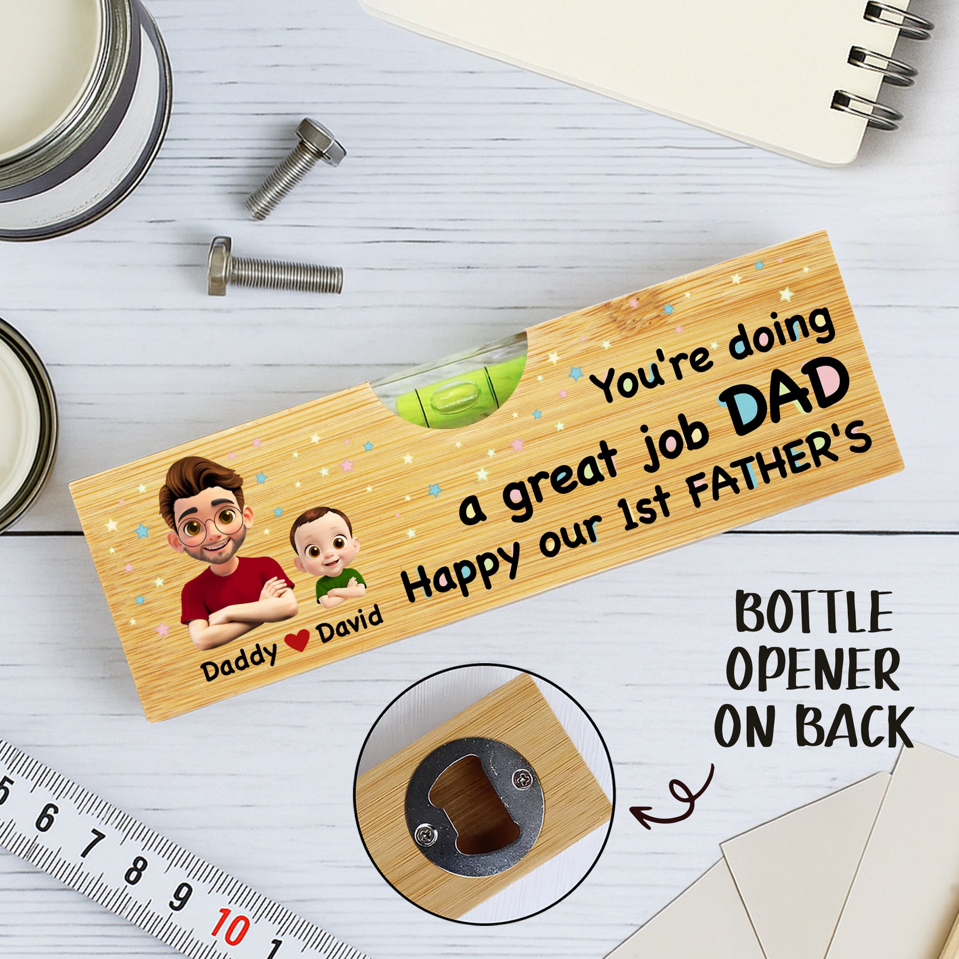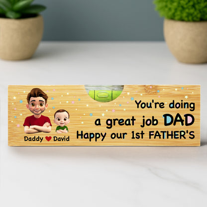 You're Doing a Great Job Dad Happy Our 1st Father's, Cartoon Portraits - Personalized Wooden Spirit Level With Bottle Opener - DAD013_PLEV