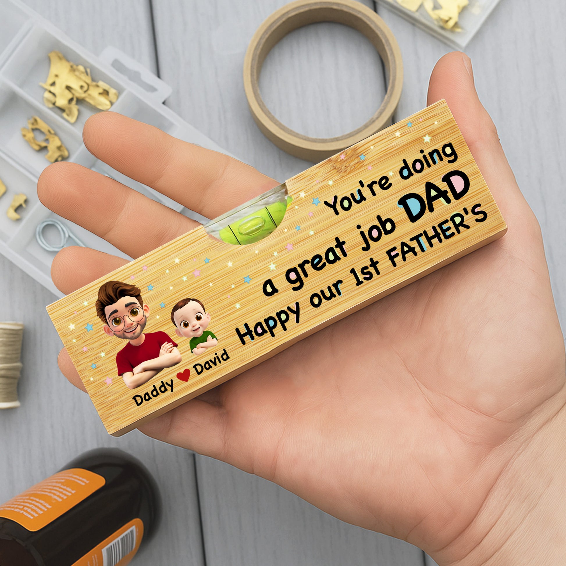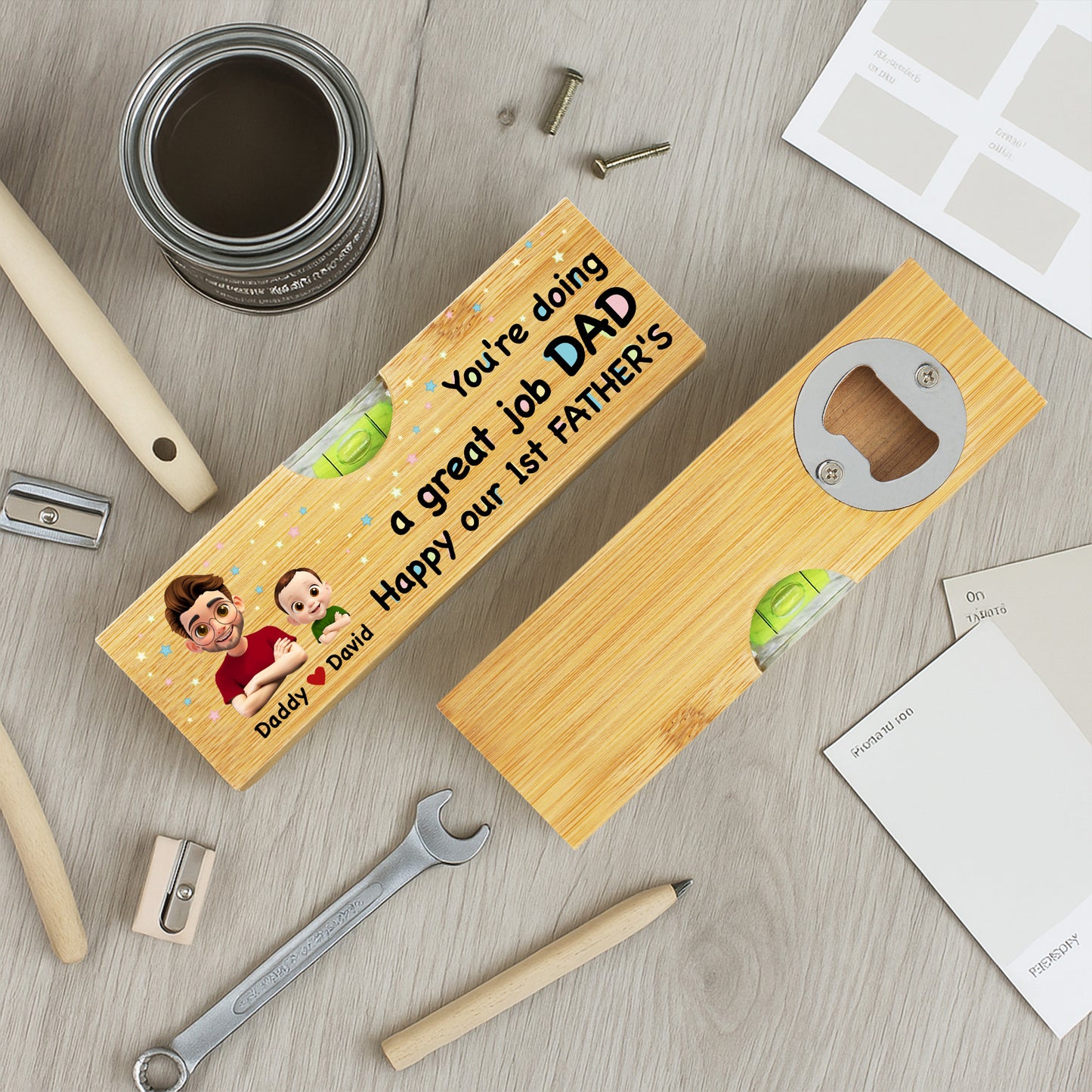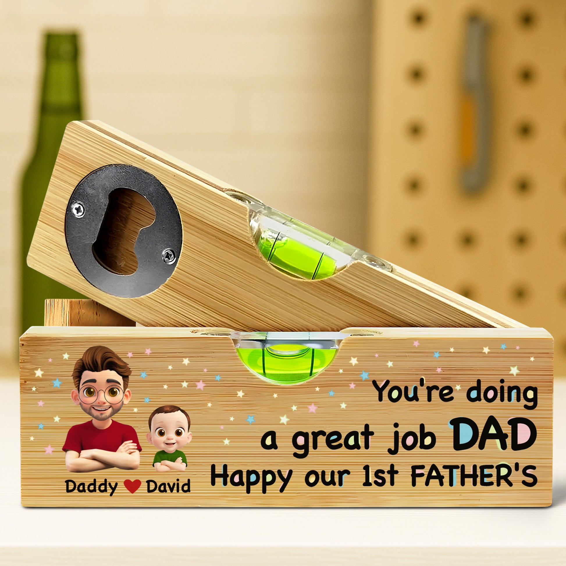 You're Doing a Great Job Dad Happy Our 1st Father's, Cartoon Portraits - Personalized Wooden Spirit Level With Bottle Opener - DAD013_PLEV